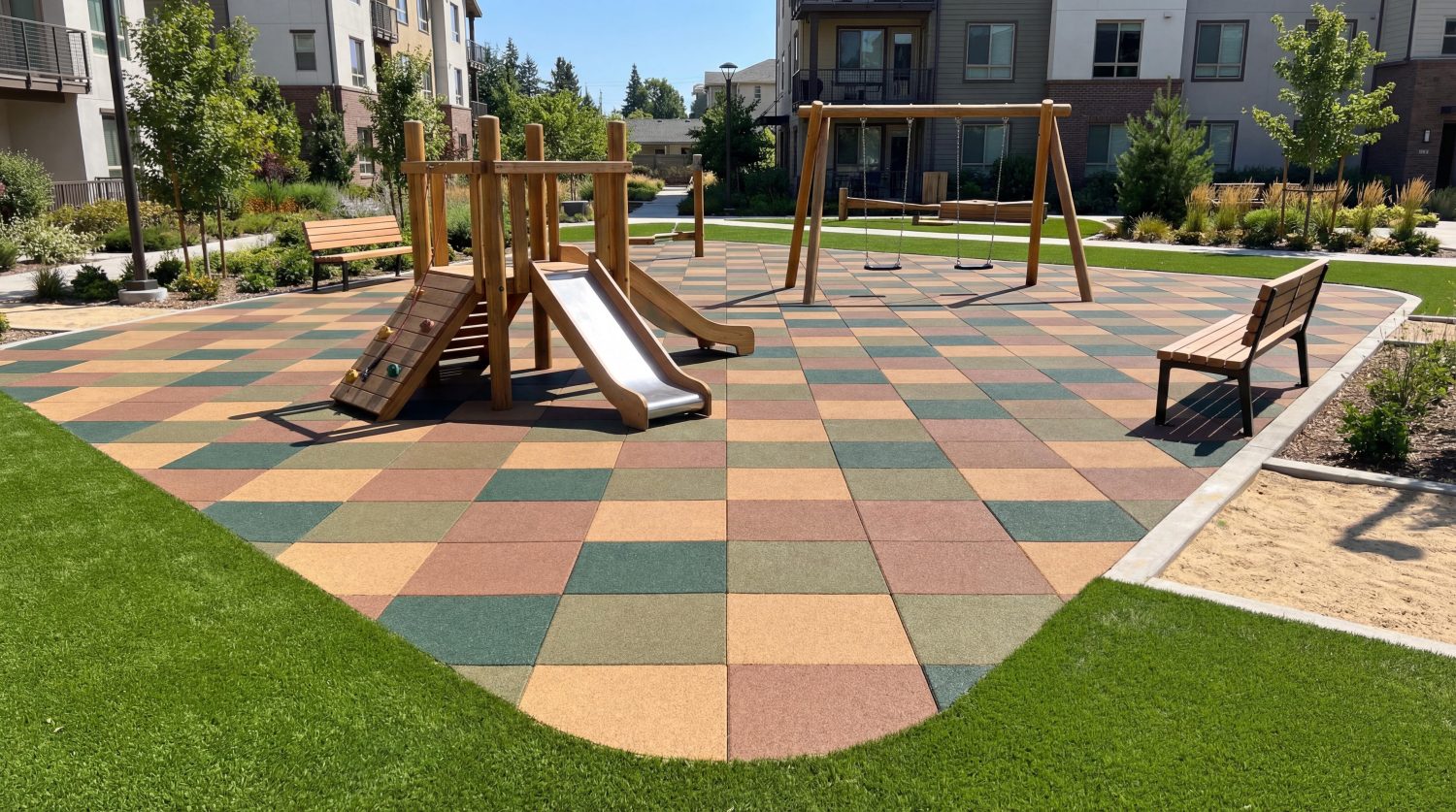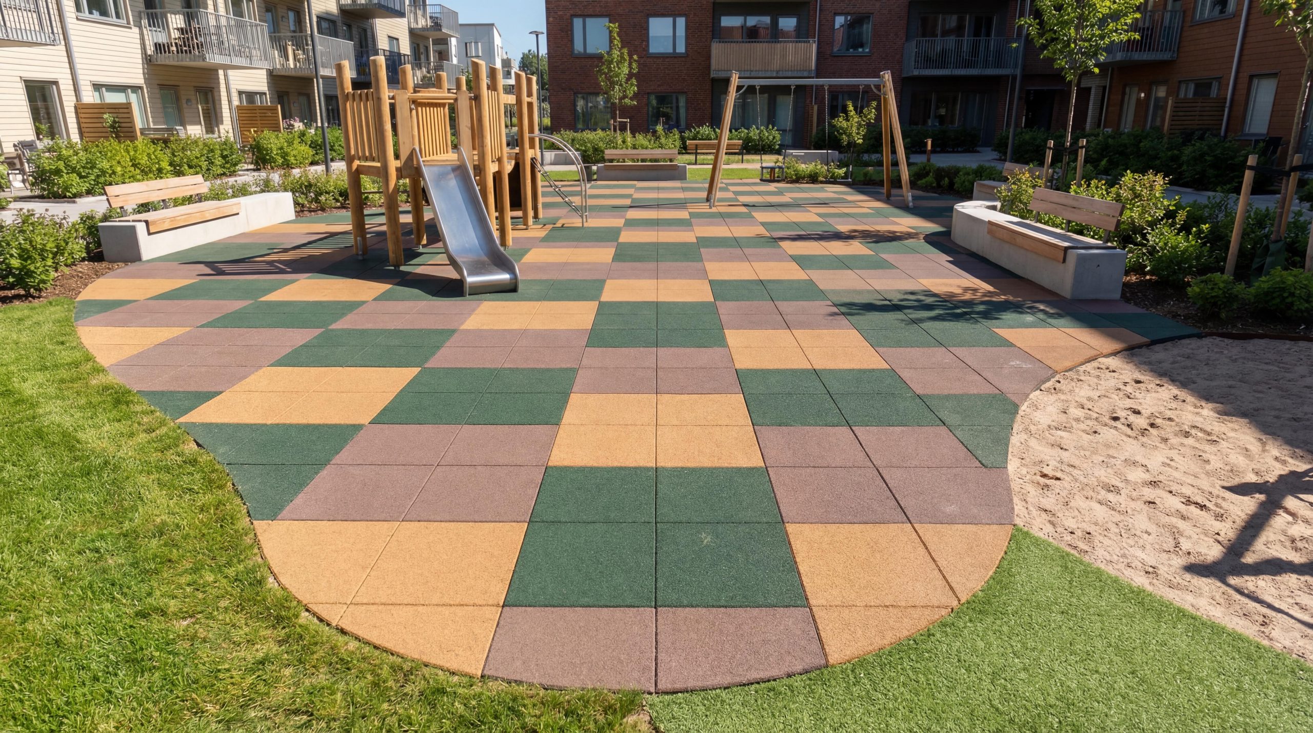 EPDM-topplagret finns i över 20 färger, vilket möjliggör kreativ gestaltning, zonindelning och anpassning till platsens identitet, utan att kompromissa med säkerhet eller miljö.