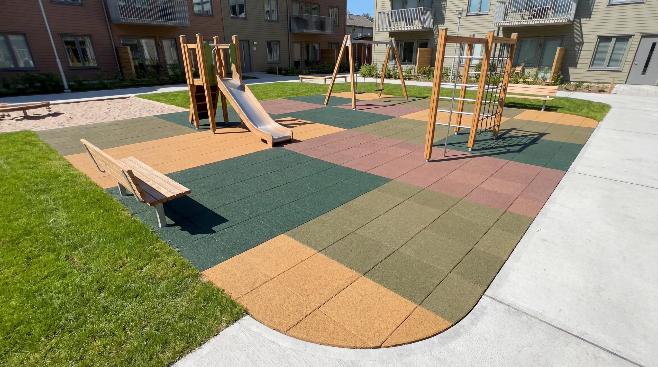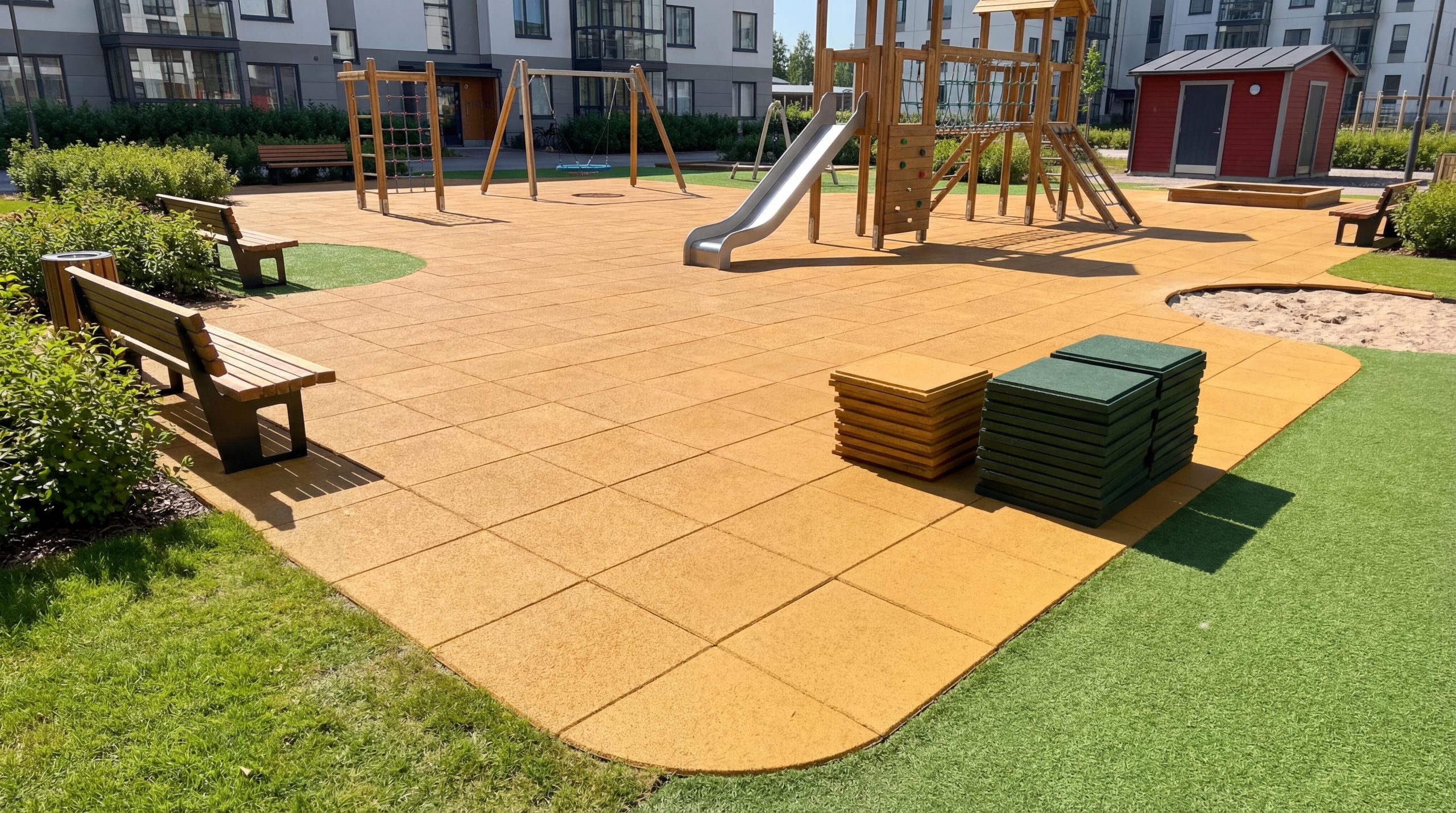 Det som skiljer Nordic Safe Tiles från traditionella fallskyddsplattor är att topplagret är utbytbart. När slitlagret är nedslitet byter du bara toppen, inte hela systemet. Det innebär lägre kostnad över tid och mindre materialförbrukning.